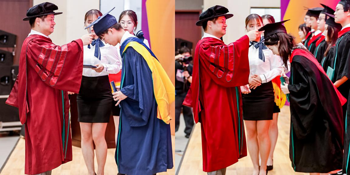 万忠娟副书记宣读了学校关于我院硕士、学士学位授予的决定。在全场师生的共同见证下,欧阳钢锋院长为到场的毕业生依次颁授学位、拨穗,并合影留念;并通过“云拨穗”的方式为境外的国际留学生授予学位。现场仪式感强烈,氛围温情满满。