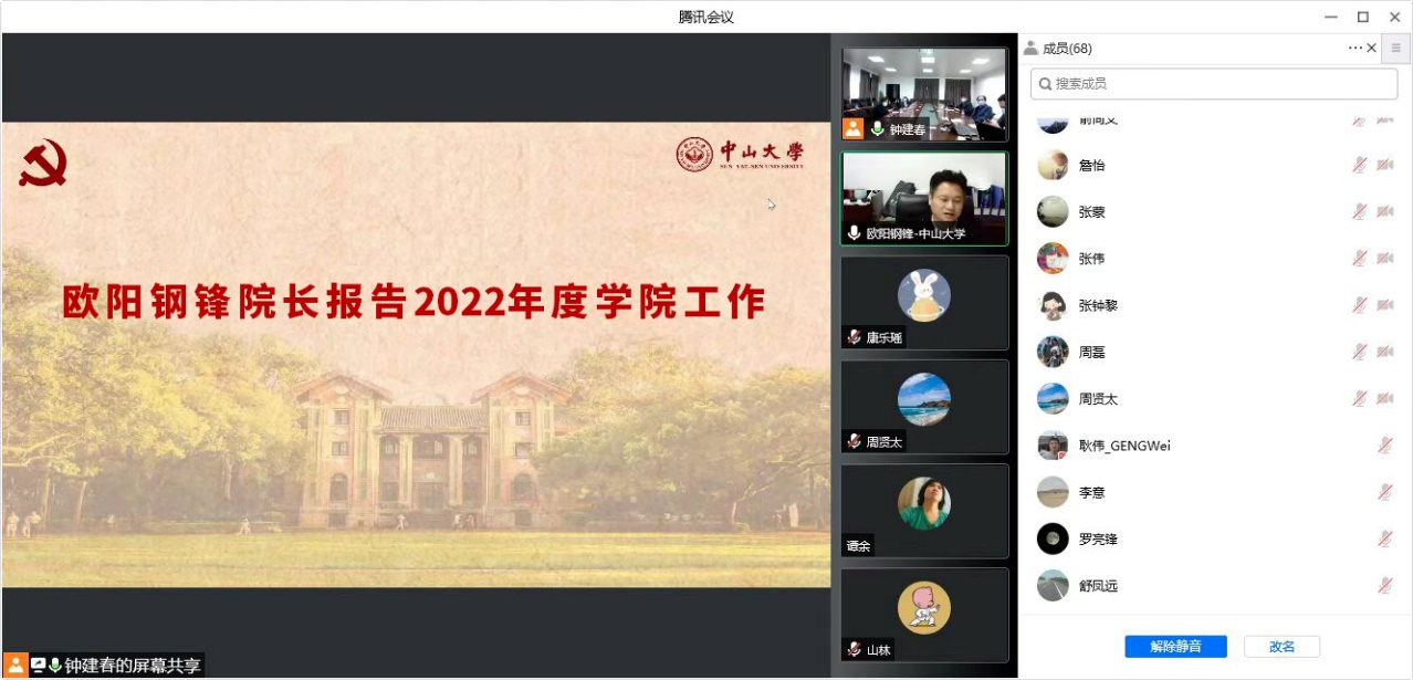 大会传达了陈春声书记在秋季工作会议上总结报告的有关精神;通报了学校近期违规违纪的典型案例并开展了警示教育。要求全院教职工在师德师风建设、科研经费管理、研究生招生、设备资产采购等方面严格遵守纪律和学校规定,党员干部要严格落实中央八项规定精神,共同营造风清气正的政治生态。欧阳钢锋院长作学院年度工作报告。欧阳院长指出,2022年学院坚持和加强党的全面领导,筑牢立德树人根基,全体教职工凝心聚力,砥砺奋进,推进学院人才引育、科学研究、人才培养、平台与实验室建设及行政后勤工作等取得明显进步。2023年,学院将重点加强领军人才引进,进一步完善本科教学体系,深入推进产学研合作研究,持续加强教学科研平台建设,着力提升学院学科建设水平。欧阳院长希望全院教职工和学院发展同向同行,以优异的教学科研成绩,助力学院高质量内涵式发展。