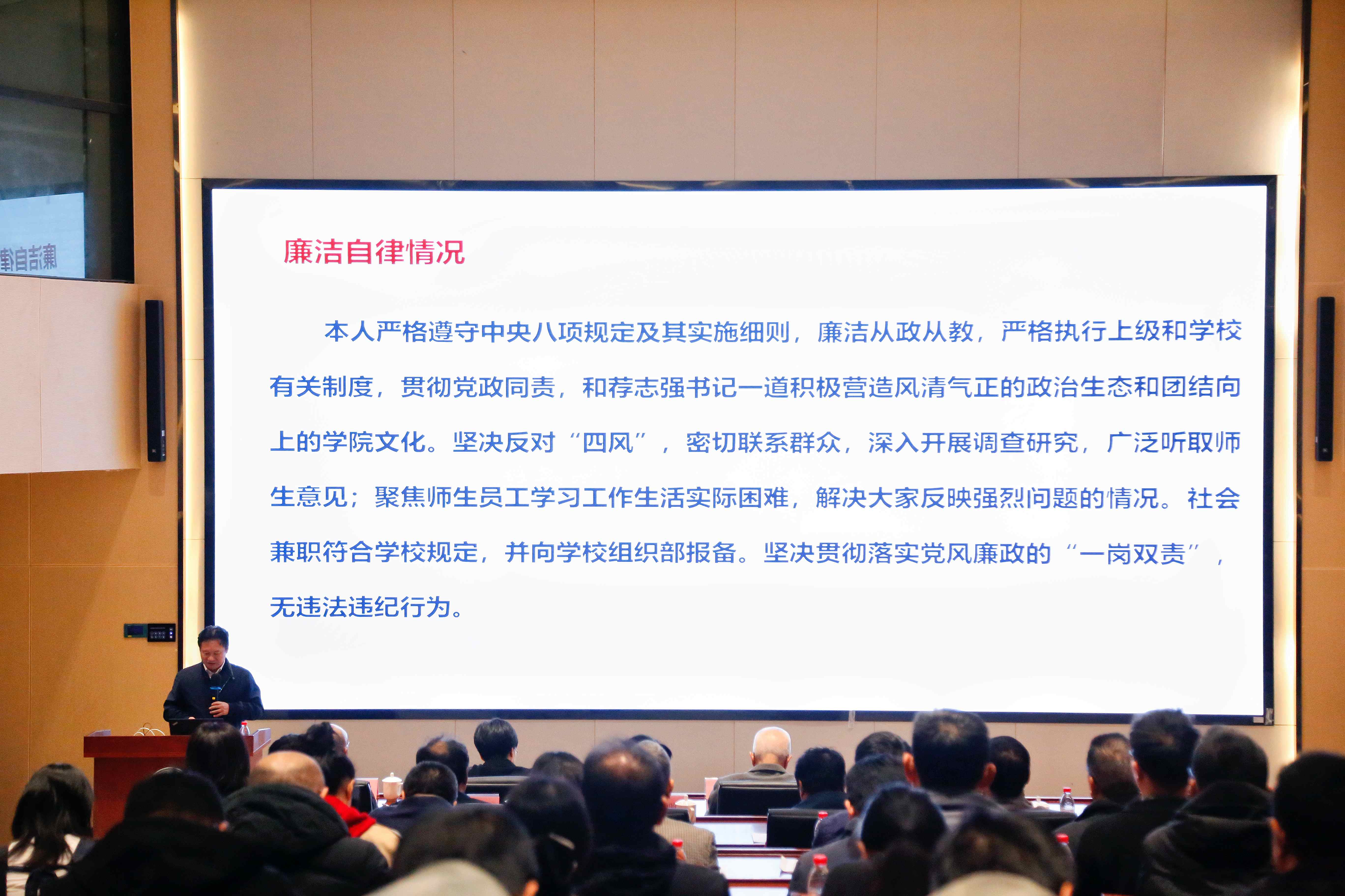 薛铭副院长、孟国哲副院长、陈正乾副书记依次从德能勤绩廉五方面进行了述职述廉,与会教职工对学院领导工作进行了现场投票考核。