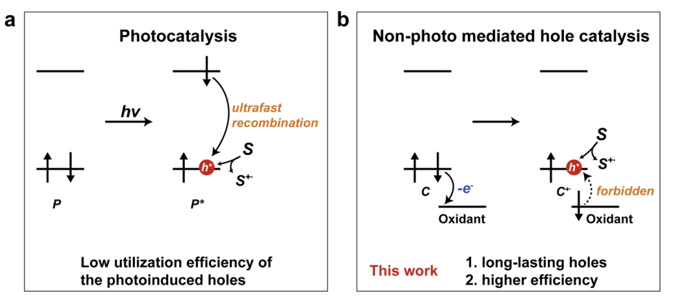 受传感领域研究的启发,中山大学化学工程与技术学院欧阳钢锋院长团队提出了一种简单的策略:利用超氧化物的强吸电子效应,通过捕获催化剂表面的电子,在其表面产生具有高氧化电位和长寿命的空穴载流子。以过硫酸盐为模型超氧化物,以缺陷态碳纳米管为催化剂,构筑了首个非光介导的高效空穴氧化体系,在水中污染物催化降解方面展现了卓越的性能,催化效率显著优于光催化技术,这为具有长寿命载流子体系的构筑提供了新的思路。