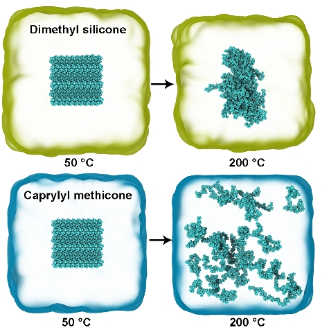 然而,上述三元体系不仅成分较为复杂,变量较多,且十六烷冰点(18.2 °C)较高,难以在低温下条件下使用。研究团队想到将“溶解基团”与“润滑基团”结合在同一分子上,结合分子动力学模拟的手段,选择了辛基硅油/聚丙烯体系作为涂层构筑材料。其中,分子动力学模拟结果表明,辛基起到了“稀释剂”的作用,与聚丙烯发生相互作用从而促进其溶解,硅氧烷基团则调节了体系的相容性,使其在低温下发生分相,同时也作为润滑剂的主要成分。