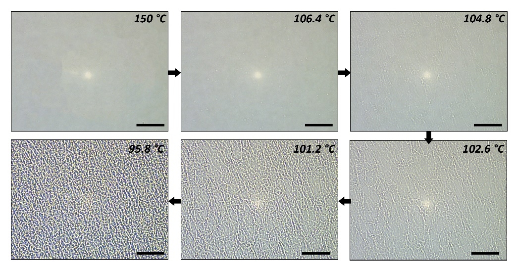 研究团队利用偏光热台显微镜原位观测了聚合物与润滑剂之间的分相过程。在降温过程中能够明显看到聚合物随温度降低从体系成核析出并最终形成颗粒网络,结合DSC等手段可以得出体系经历了液-液分相与液-固分相两个阶段。