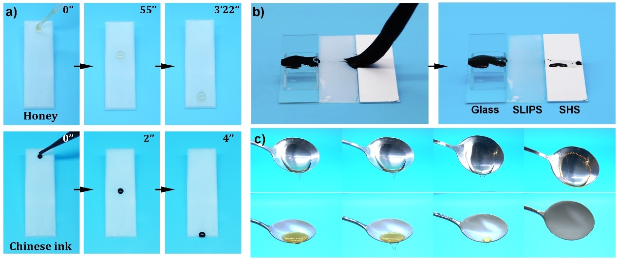 上述SLIPS涂层展现出优异的润滑性能,对不同液体甚至高粘度的蜂蜜都表现出良好的抗粘附性。同时,涂层具有优异的抗冰粘附性能,冰粘附力最低可达1.9 ± 0.4 kPa,具有良好的防冰应用前景。