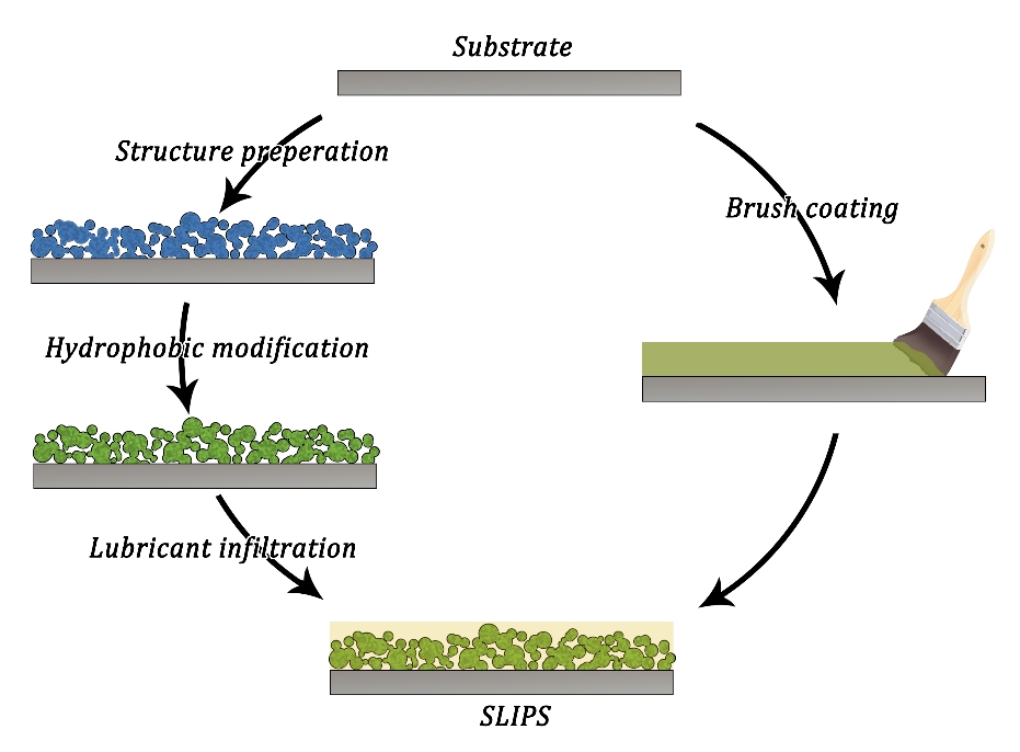 自然界中有许多神奇的植物,例如猪笼草可以利用它的超滑表面进行捕食:停留在它表面的昆虫一旦没站稳滑落到袋中,便会成为它的一顿美餐。这种超滑表面源于其微观结构表面覆盖了一层润滑液,受此启发,哈佛大学Aizenberg教授课题组于2011年首次提出了一种仿猪笼草表面的超滑表面——液体灌注超滑表面(SLIPS)。构建SLIPS一般包括三个步骤,首先在基底构筑粗糙多孔的可储液结构,然后进行疏水化改性以保证其在应用时润滑液体不会被工作液体置换,最后进行润滑液的灌注。特殊的表面液层使得SLIPS具有优异的抗黏附性质,可应用于防污、防腐、防冰、防菌、防垢以及强化传热、液体操控、空气集雾等多个领域。因此,SLIPS作为超疏水涂层后新一代的特殊浸润性涂层,在最近十年来受到了广泛的关注与研究。然而,如上所述,传统的SLIPS制备过程较为繁琐,且常见的基底结构构筑方法适用面积较小,有的方法对基底材料有严格要求,从而阻碍了SLIPS涂层的大规模应用。