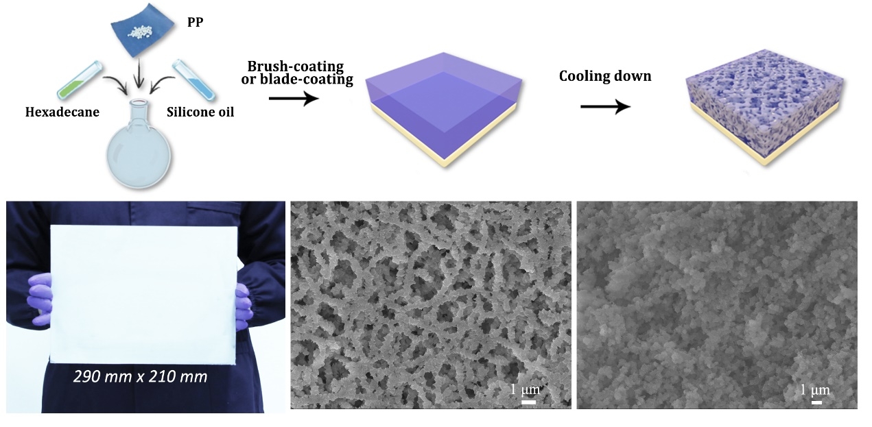 TIPS的主要原理为:聚合物与稀释剂在高温下形成均相溶液,在低温下发生分相形成固-液复合结构。为了实现一步法制备SLIPS涂层,需要寻找一种可在高温下溶解聚合物,低温下则与聚合物发生分相的润滑剂,而传统的硅油类润滑剂均较难溶解聚合物。因此,研究团队在体系中加入了第三组分作为助溶剂,发展了聚丙烯/硅油/十六烷三元分相体系。经过低温分相过程,涂层内部形成了由微米小球串连在一起所形成的网络结构,通过毛细作用将润滑剂吸留在网络内。